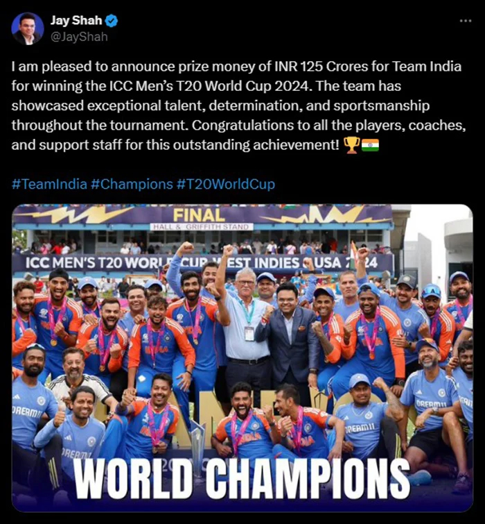 بھارتی کرکٹ بورڈ بی سی سی  آئی کے سربراہ جے شاہ نے سماجی رابطے کے پلیٹ فارم ایکس پر بھارتی کرکٹ ٹیم کے لیے 125 کروڑ بھارتی روپے یعنی تقریباً 4 ارب پاکستانی روپے کی انعامی رقم کا اعلان کیا ہے۔